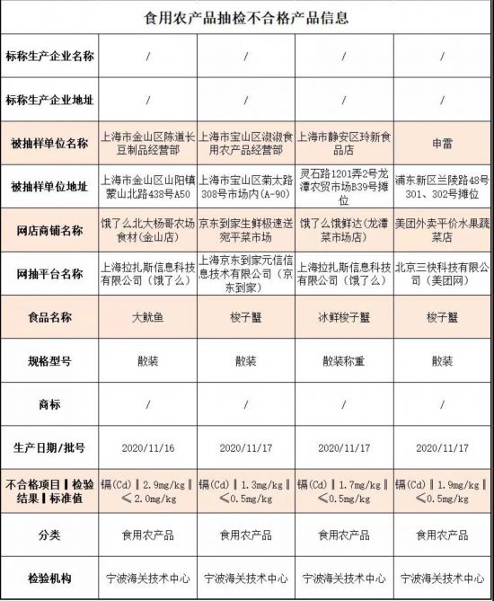 去年11月18日,上海市市場監管局曝光了4批次重金屬含量超標的梭子蟹,不合格樣品采樣自盒馬鮮生、餓了么、京東到家等平臺。