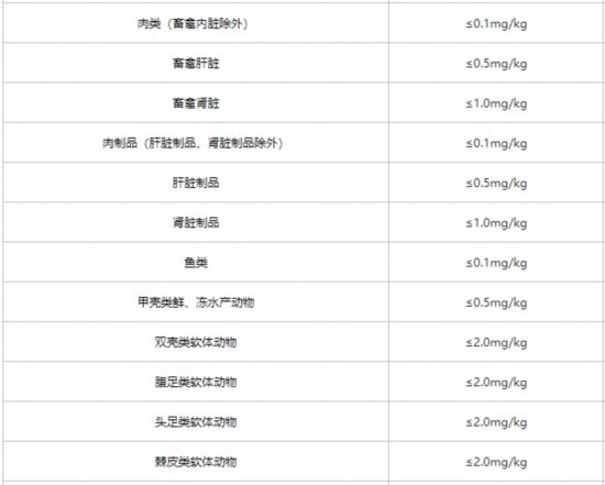鎘在部分食品中的限量要求,摘自我國國家強制性標準《食品中污染物限量》
