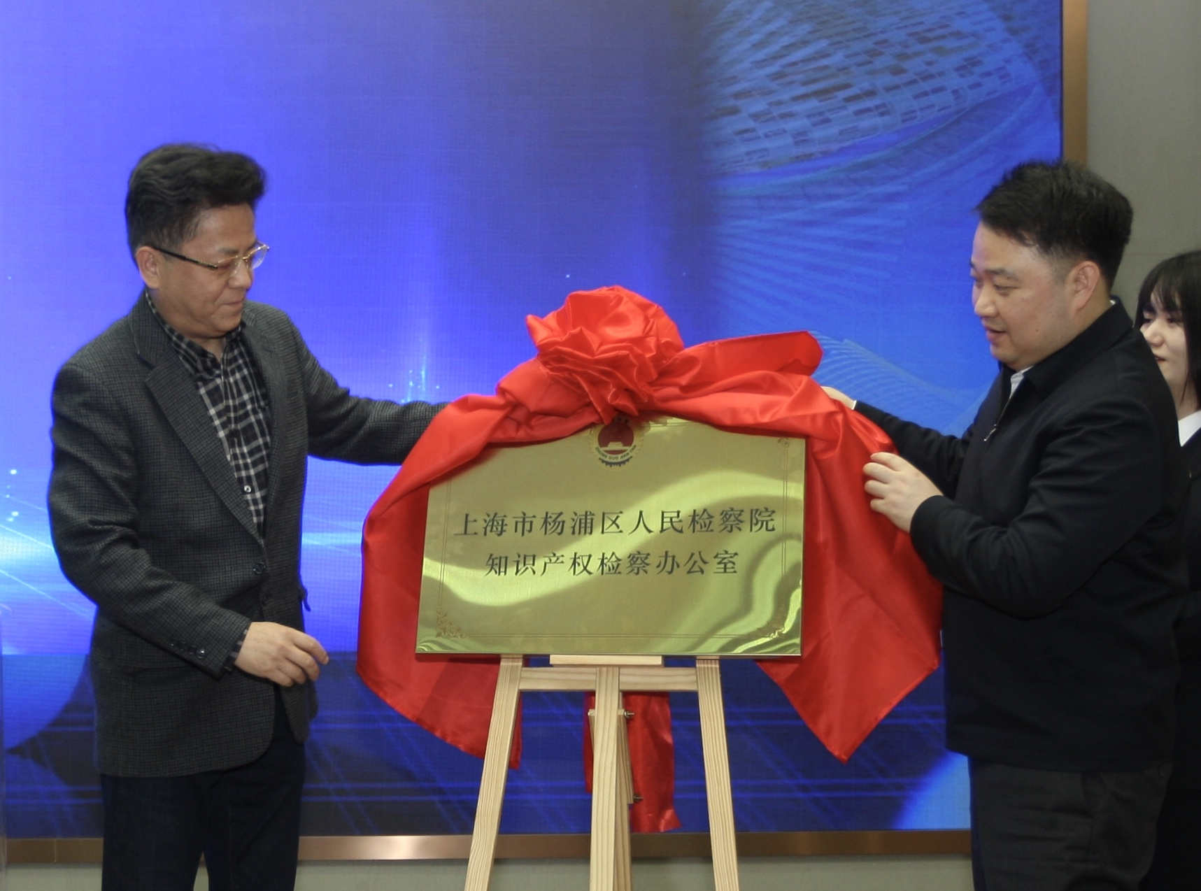上海市人民檢察院副檢察長龔培華和楊浦區副區長趙亮共同為楊浦區院知識產權檢察辦公室揭牌。