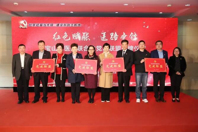 啟動儀式上,復旦大學附屬中山醫院黨委與吳淞中心醫院黨委、上海交通大學附屬仁濟醫院黨委與區大場醫院黨總支、上海中醫藥大學附屬曙光醫院黨委與區中西醫結合醫院黨委、華山醫院北院黨委與仁和醫院黨總支建成寶山區醫療聯合體黨建聯盟。