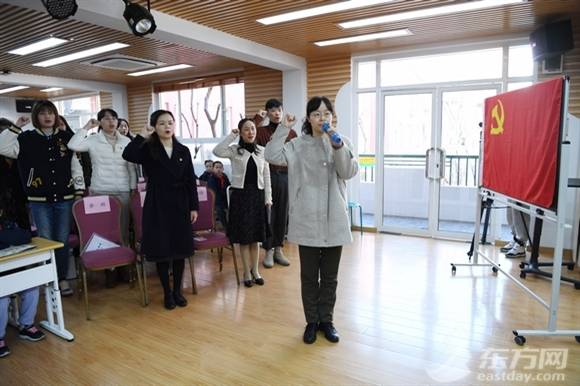 在學!皩W黨史”主題活動啟動儀式上,蓬萊路第二小學黨支部書記余禎帶領全體黨員高舉右手,重溫入黨誓詞。