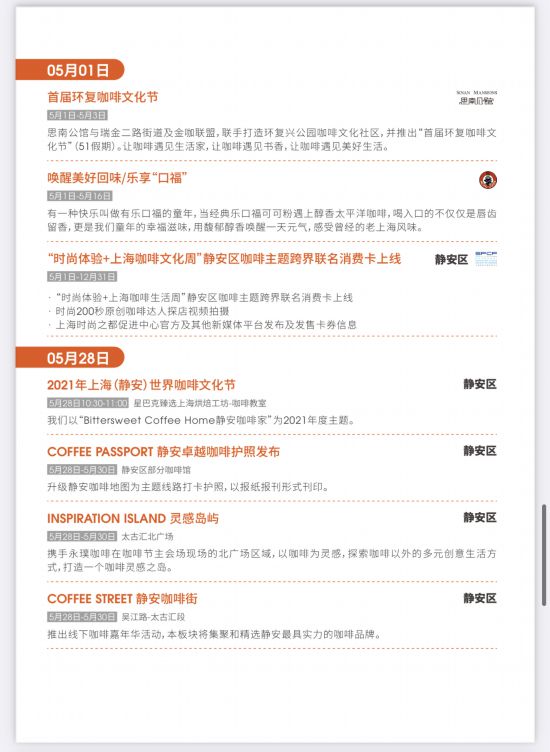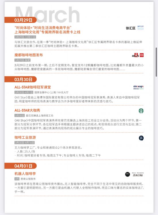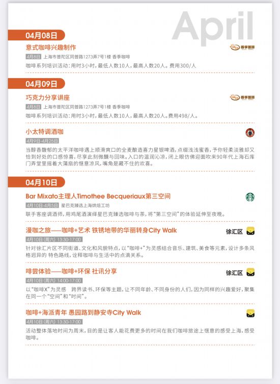 咖啡產業鏈上的各大品牌也將助力上?Х任幕。星巴克臻選上海烘焙工坊及全市部分臻選門店將同步推出“致敬上!闭檫x限定咖啡飲品及商品,并在店內舉辦豐富多彩的咖啡教室活動。3月下旬開始,太平洋咖啡、香季咖啡學院、麥隆咖啡、SEESAW咖啡、王力咖啡將帶來限定咖啡飲品、咖啡講座、咖啡工業旅游、老上海風情陳列展示、機器人咖啡亭、上海特調等一系列活動。作為上海知名的周末文藝生活目的地,思南公館將推出思南夜派對咖啡主題市集,為市民提供周末好去處。
