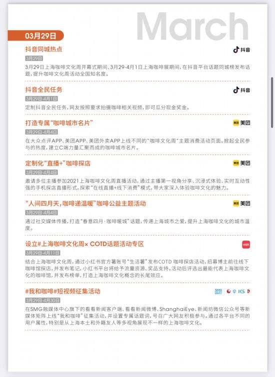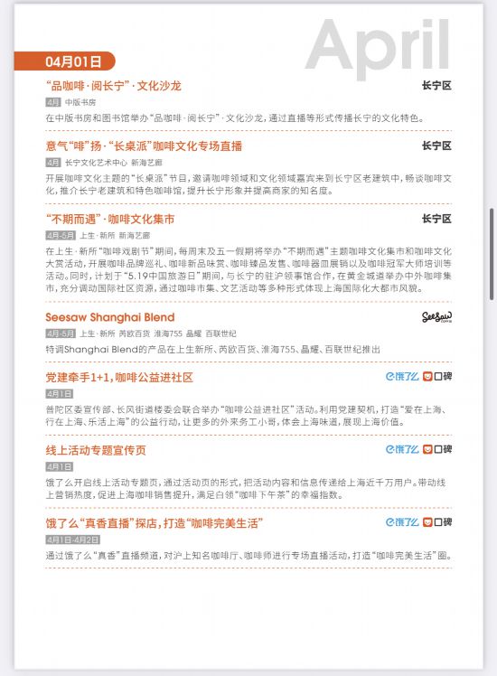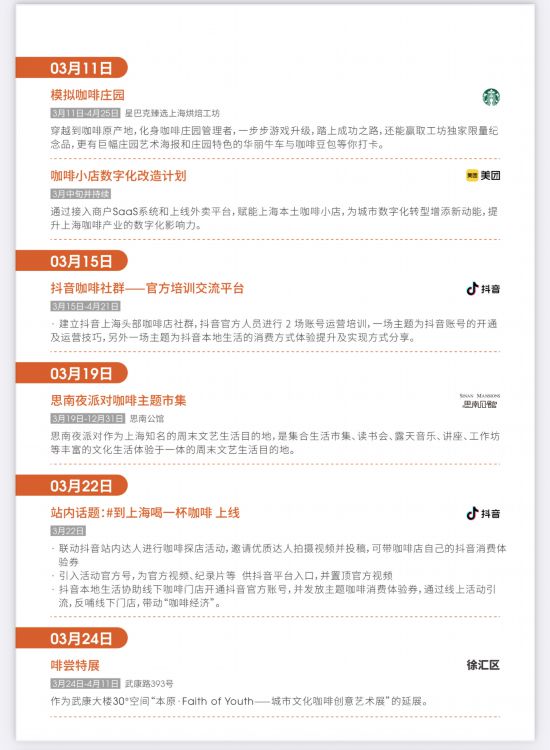互聯網平臺的加入讓活動玩法變得更加多彩。抖音、美團、嗶哩嗶哩、小紅書、餓了么等平臺都將設立咖啡文化周相關話題、專區、專屬活動,鼓勵用戶上傳優質內容,參與線下活動,全面營造咖啡文化氛圍,促進咖啡文化推廣。上海時尚之都促進中心、游俠客等也將推出特色活動,如消費卡、咖啡微旅行線路等。