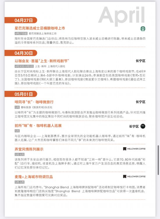 今年上半年,黃浦將聚焦環復文化帶和演藝大世界,推出咖啡演出、消費優惠等活動;靜安將依托世界咖啡文化節,推出咖啡護照等特色活動;徐匯充分發揮區域優勢,通過咖啡特展、城市微旅行等方式傳遞咖啡文化;長寧依托空間資源,舉行咖啡跨界融合活動;浦東與虹口則將在下半年陸續上線本區特色咖啡活動。繽紛多樣的形式釋放出各區地標場景的吸引力,更能滿足不同層面消費者的精神文化需求。