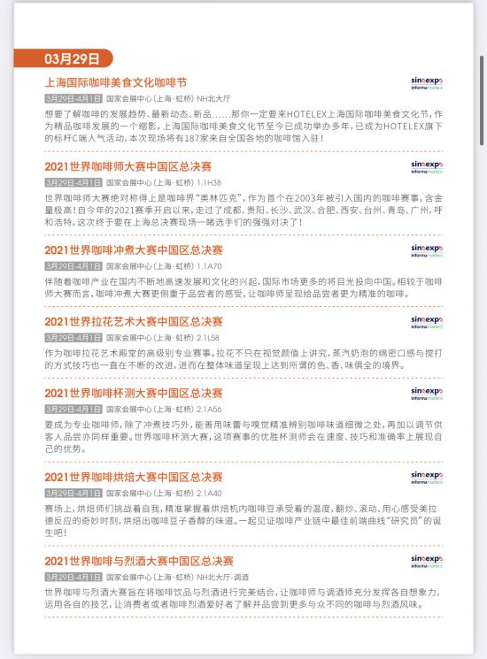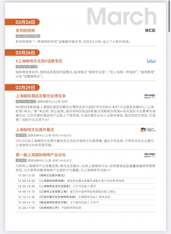 3月29日,上?Х任幕軐⒃谏虾:鐦驀視怪行挠瓉黹_幕式,并舉辦第一屆上海國際咖啡產業論壇及6場國際性咖啡賽事和大規模的咖啡節體驗活動。圍繞“場景融合”“內容融入”“產品融匯”等主題,各區和各產業主體將發揮各自優勢,舉辦上?Х任幕艿难由旎顒,深化市民對咖啡及咖啡文化的認知,促進咖啡與公共空間、與市民喜聞樂見的文化產品與文化內容融合,讓市民以咖啡為媒介,更深層次地感受上海的城市溫度與城市魅力;同時,在開展產業研究的基礎上,促進體驗消費、推動業態融合、搭建交流平臺、加強產業引導,推動咖啡產業更高質量發展;顒又芷趶3月下旬持續到年底,讓更多市民體驗上?Х任幕莫毺伧攘。