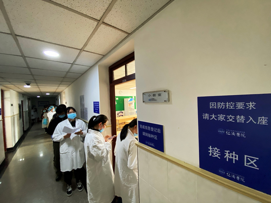 24日上午十一點左右,記者來到上海交通大學醫學院附屬仁濟醫院東院區教學樓內,看到醫院職工正在排隊接種新冠疫苗,負責接種疫苗的醫務人員告訴記者,從建檔、登記到接種完畢后,所有人員還需留觀30分鐘。從早晨八點開始,已有50多位醫院工作人員相繼完成疫苗接種。