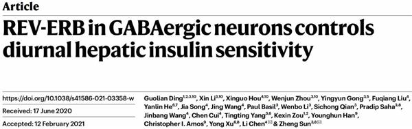 北京時間2021年3月25日凌晨,《Nature》雜志在線發表了由復旦大學附屬婦產科醫院/生殖與發育研究院丁國蓮課題組與美國貝勒醫學院孫正課題組以及山東大學齊魯醫院陳麗課題組等合作完成的研究論文。該研究報道了下丘腦視交叉上核(SCN)區GABA神經元的REV-ERB基因控制胰島素抑制肝臟糖異生的晝夜節律,對于深入了解中樞神經系統對外周糖代謝的時空調控具有重要的意義,這也將有助于指導糖尿病患者血糖控制策略。
