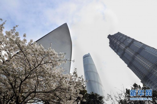 3月24日拍攝的櫻花掩映的上海環球金融中心(左)、上海中心和金茂大廈(右)。