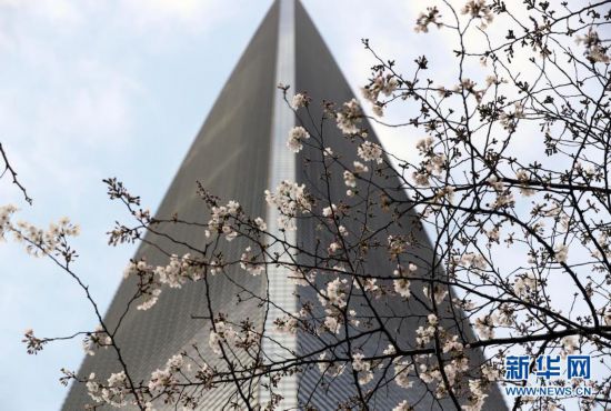 3月24日拍攝的櫻花掩映的上海環球金融中心。