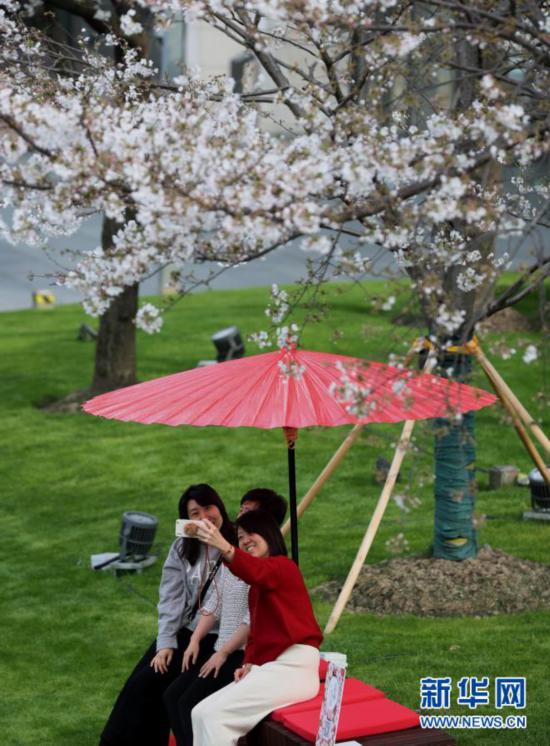 3月24日,上海環球金融中心大廈旁的櫻花樹下,路人在自拍。