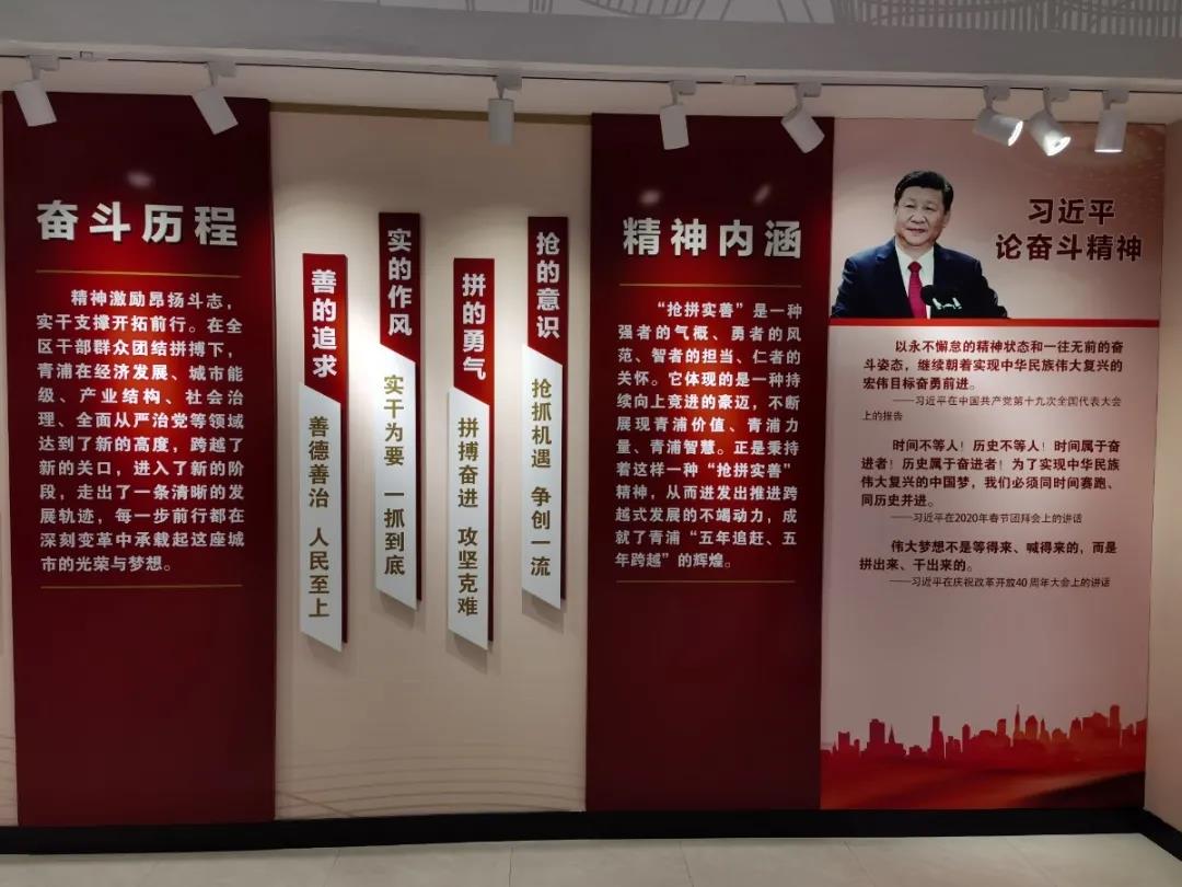 黨的十八大以來,在習近平新時代中國特色社會主義思想指引下,在區委的堅強領導下,青浦的干部群眾勇于拼搏、敢于擔當、樂于奉獻、實干為民,鑄就了新時代青浦奮斗精神。為進一步弘揚這種精神,青浦區委黨校精心打造“新時代青浦奮斗精神”主題教育館,鼓舞全區干部群眾擔當新的使命,開創新的事業,繼續勇往直前、高歌猛進。