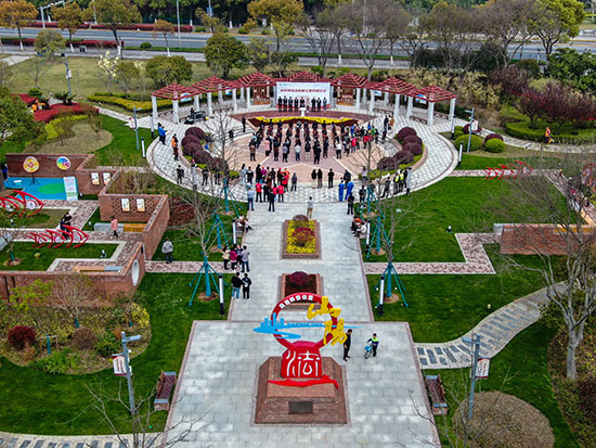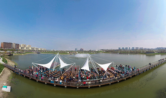 作為上海灣區的重大景觀工程項目之一,匯龍湖公園由新城公司、金山區水務局、金山區綠容局等單位共同建設,該公園占地面積達2.9萬多平方米,以“人水相親”與山陽文化中的“民樂”為核心,為居民們帶來一個城水相依、人水相親、水清岸綠、樂水宜居的美好生活環境。在當天的開園儀式上,來自山陽中小學、東方村、金豪、三島龍洲苑等地的近300名民樂愛好者,手持二胡、古箏等民族樂器,在親水步道和親水平臺上組成8個民樂表演方陣,同奏民樂,氣勢壯觀,充分展示了中國民間文化藝術之鄉——山陽深厚的文化底蘊。