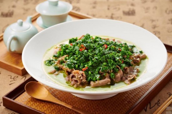 上海人喜歡吃田螺,家里一般都會做田螺塞肉。但在大廚的手里,肉餡變成了手工自制的青蝦蝦膠,和田螺肉拌在一起,讓河鮮、海鮮的雙鮮融合,成為了一道看似簡單實則頗費功夫的時令菜蝦膠釀田螺。還有春天的韭菜和山筍,是“馬大嫂”們都知道的時鮮貨。牛舌切成2毫米薄片,再和脆嫩的韭菜一起爆炒,牛舌鮮嫩,韭菜爽口,一道普通的家常菜也變得口味非凡。