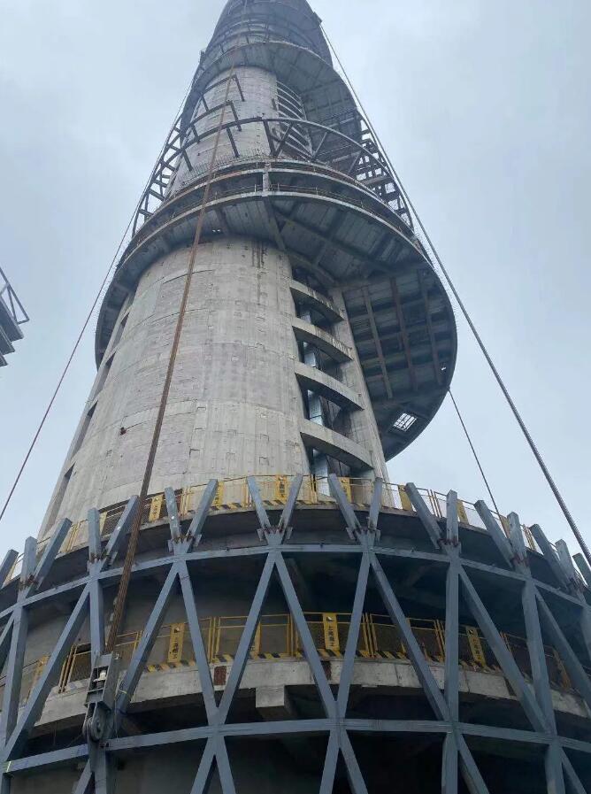 此次進行提升的觀光塔幕墻鋼結構,為不共面、圓筒狀高聳鋼結構,由上下左右不共面三角形單元空間擬合而成,包含三大段大落空區域吊掛段,最大吊掛距離44米。