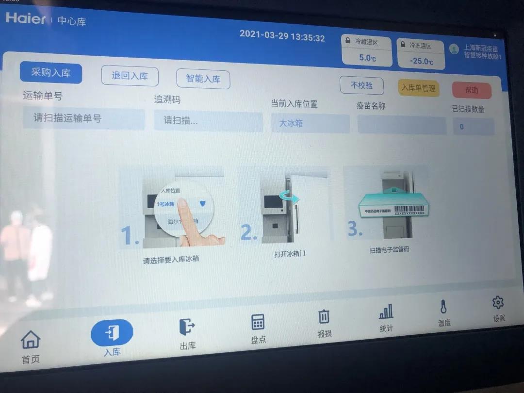 海爾生物醫療華東區域負責人李寶告訴記者,疫苗冷鏈配送公司將疫苗運送到方艙,就會存儲到冰箱里,通過掃描槍掃描疫苗上的電子監管碼,溫度、運輸單號、追溯碼等信息可實現全程可追溯。