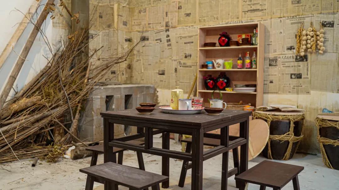 臉盆架上放著印有紅色囍字的陶瓷臉盆,整面石墻貼滿舊報紙,床上擺放著軍大衣和枕巾,灶頭邊堆滿柴禾,炊煙裊裊升騰,這間農村房生動地還原了上世紀八九十年代的生活情境。
