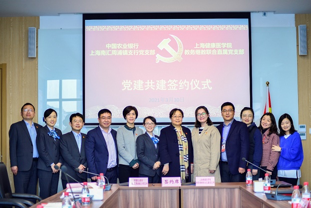 同時,為進一步探索創新黨建工作,上海健康醫學院教務繼教聯合直屬黨支部與中國農業銀行上海南匯周浦鎮支行黨支部,在周浦鎮社區黨群服務中心舉辦了黨建共建簽約儀式。旨在以“共建、共管、共贏、共幫、共享”為目標,借助座談會、講座咨詢、服務群眾等黨建特色活動,融合雙方資源、發揮雙方專業優勢,以共建促黨建、以創新強黨建。