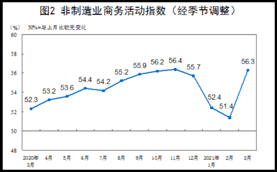 同時,數據顯示,3月份,非制造業商務活動指數為56.3%,較上月上升4.9個百分點,表明非制造業擴張有所加快。