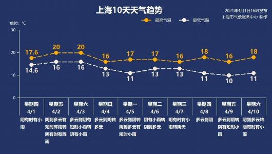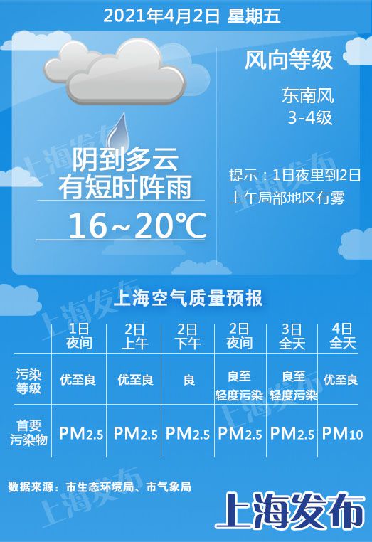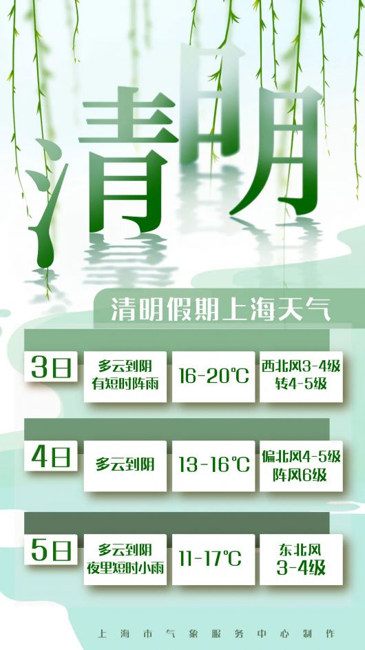 據上海發布,市氣象服務中心公布清明假期天氣預報:4月3日多云到陰有短時陣雨,4日到5日白天以多云到陰為主,5日后期有弱降水過程。受北方冷空氣南下影響,3日夜里到4日風力增大,偏北陣風可達6級,4~5日氣溫有所下降。另外,3日早晨局部地區有霧,白天有良到輕度污染過程。