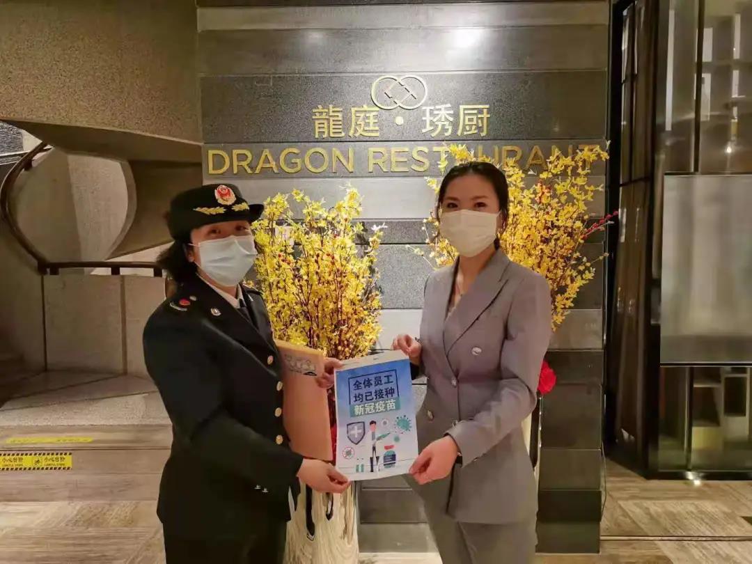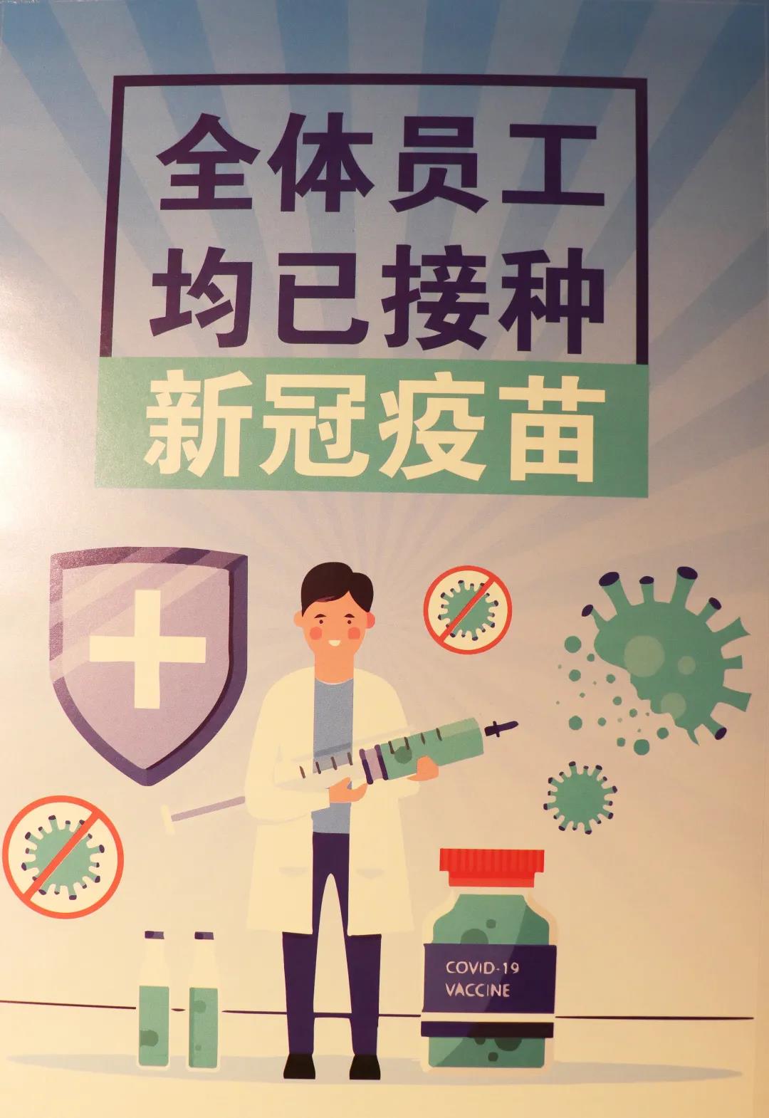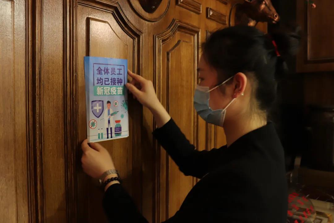 當天,“龍庭繡廚”五角場店也收到了“全體員工均已接種疫苗”的藍色標貼,該餐廳110余名員工全部完成疫苗接種。