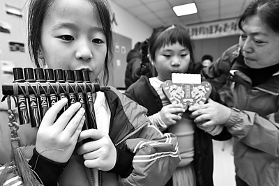 江蘇省揚州市邗江區竹西街道竹西社區兒童在周末“第二課堂”公益托管班學習體驗排簫吹奏技法。莊文斌攝/光明圖片