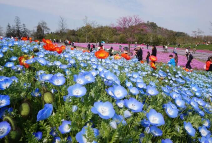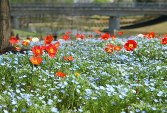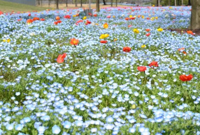 2020年播種時喜林草和虞美人一起混播,由于受天氣影響,喜林草和虞美人的花期提前了半個多月,現在的虞美人花開正艷、色彩斑斕,喜林草也逐漸盛開,遠望點點藍色,像是落入草叢中的藍色星星,喜林草藍色花海將逐漸進入最佳觀賞期。