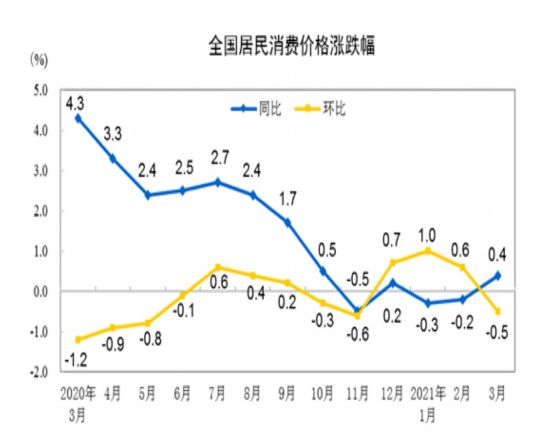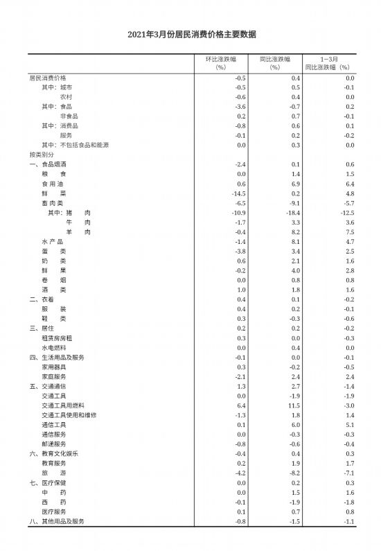 從環比看,3月份,全國居民消費價格環比下降0.5%。其中,城市下降0.5%,農村下降0.6%;食品價格下降3.6%,非食品價格上漲0.2%;消費品價格下降0.8%,服務價格下降0.1%。