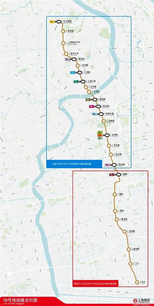 18號線一期工程起于航頭站,穿越浦東、楊浦、寶山三區,終于長江南路站,全長約36公里,南段已于2020年12月26日起開通初期運營,北段預計今年底開通初期運營。