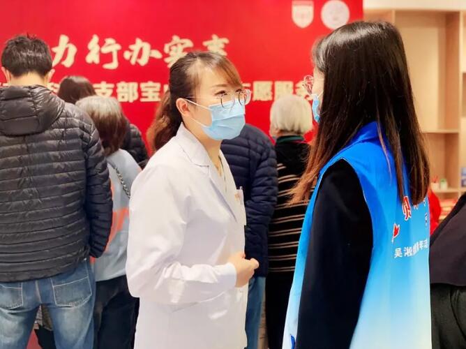 義診的過程中記者發現,在現場維持秩序的志愿者中有著兩種截然不同的“顏色”,一種是身穿白大褂的“醫生黨員”,一種是身著藍色背心的“街道黨員”,她們說,這是她們的第一次“藍白合作”。