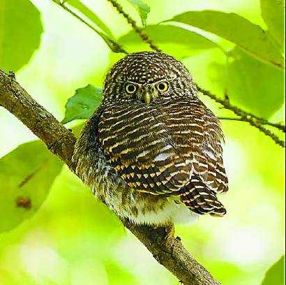 除了新朋友,一些久未露面的老朋友也來做客了。4月初,有觀鳥愛好者在南匯東灘記錄到一只領鵂鹠。身形比成人拳頭大不了多少的領鵂鹠一點也不柔弱。鏡頭中的它悠閑地“坐”在枝頭,體形比麻雀大不了多少,腳上卻掛著一只大老鼠,這種“反差萌”令人忍俊不禁。