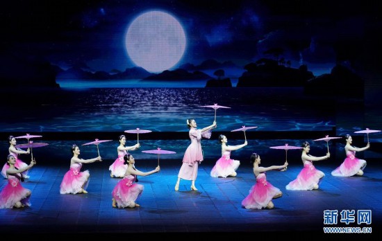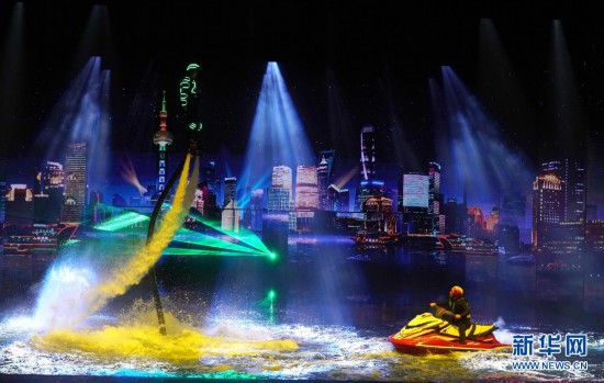4月7日,在《上海千古情》彩排中,演員在變身為“黃浦江”的舞臺上進行表演。新華社記者 任瓏 攝