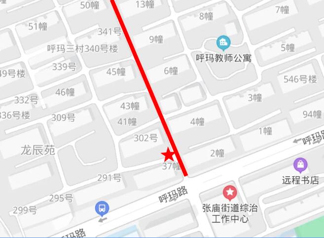 圖中紅色直線所示為呼瑪三村公共通道,紅色五角星所示處為本次修復工程位置