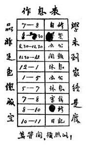 早上7點起床,自修、用餐、辦公、閱報、寫信、日記, 直到晚上11點就寢,一張《作息表》將日子碼得滿滿當當,井井有條。左右兩側,主人還書寫了一副對聯:“學未到家終是廢,品非足色總成空!辈堰@副對聯作為自己的座右銘。
