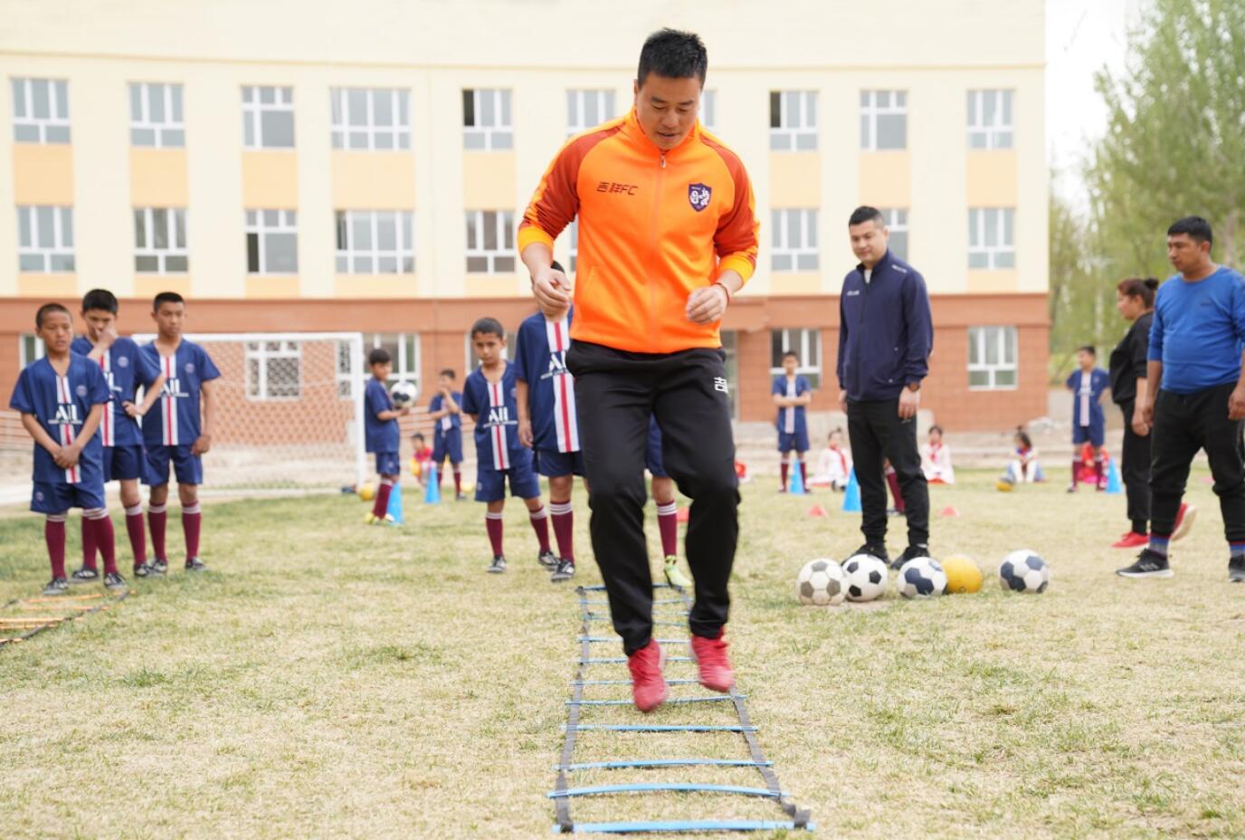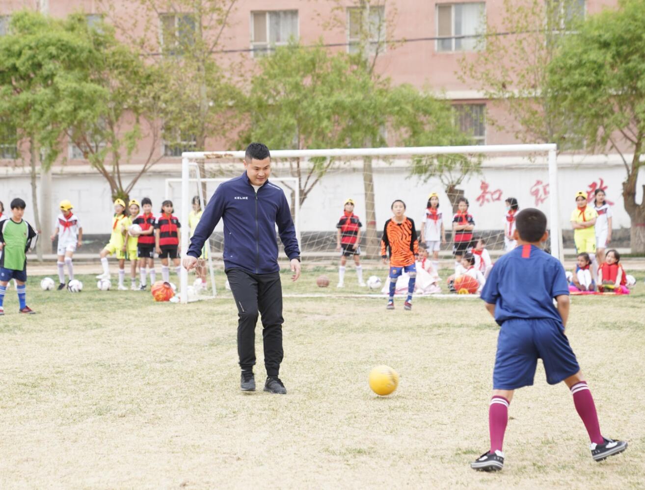 孫吉和其他隊員現場指導莎車的小隊員踢球技巧
