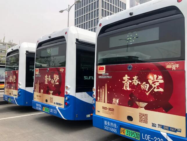 據浦東團區委項目負責人介紹,青春公交是浦東共青團近年來持續打造的一個線下主題移動場景。今年重點結合黨史學習教育,精心選取了革命、建設、改革時期有代表性的革命先烈、建設功臣、時代楷模的10條經典語錄,再輔以融合浦東元素的紅色設計,制作成車身外圍裝飾,投放于全國青年文明號82路、浦東35路等7條公交車線路,車身側面的“跨越百年的青春告白”以及尾部的“青春向黨”特別的醒目。