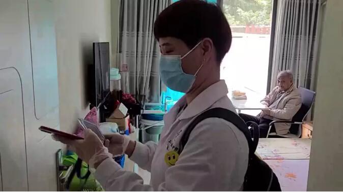 走進家門后,朱衛首先打開長護險手機應用,現場拍照簽到,向后臺實時上傳簽到信息。當朱衛走進老人臥室開始護理時,安裝在房門上的RFID標簽便自動感應到她服務胸卡上攜帶的接收器,在后臺又形成了一條無感知打卡記錄。