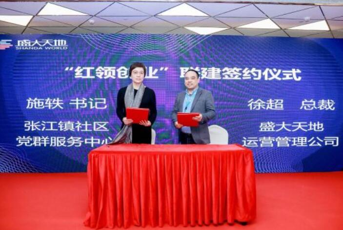 由張江鎮社區黨群服務中心與盛大天地·源創谷聯合建設的“紅領創業”基地,在本次活動中舉行了簽約儀式。張江鎮社區黨群服務中心書記主任施軼和盛大天地(上海)經濟發展有限公司總裁徐超共同上臺簽署了聯建協議。