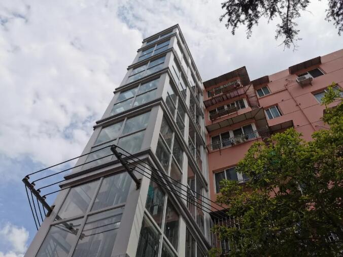 在永清路337弄1號樓外側,一部嶄新的全透明外觀、全玻璃幕墻的外掛電梯高高聳立,底部的電梯入戶通道設計,使得電梯與住戶能夠“完美契合”。作為永清新村電梯安裝工程的試點,337弄1號樓的電梯已經正式“上崗”,為居民提供服務。