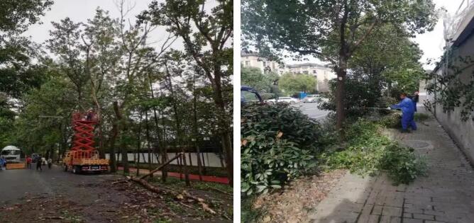 針對強臺風,為防患于未然,羅星公司針對馬路和小區高空綠化開展汛前清理,對于枯枝死樹進行修枝砍伐,防止大風、大雨等極端天氣時造成折斷、掉落,砸傷過往行人及車輛,造成嚴重安全事故。