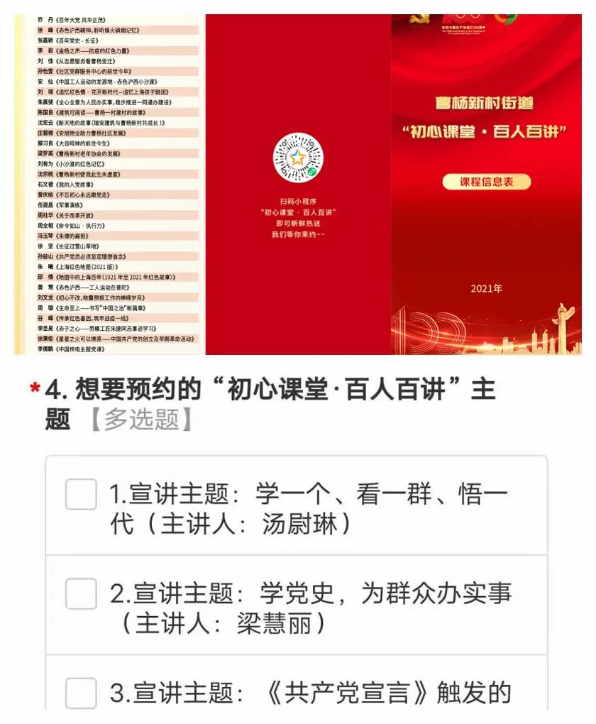 據介紹,為了用活紅色資源、講“活”黨史故事,努力用黨員群眾聽得懂、易接受、樂參與的方式,打造“指尖上的微黨課”,讓黨史課堂“行走起來”,推動黨史學習教育更加貼近群眾、深入人心。街道特邀市委、區委黨史研究室的“大咖”,普陀區“重量級”離退休老同志以及街道、居民區、區域化單位的優秀講師,來為初心課堂“加冕”。從事不同行業、來自不同區域、代表著不同年齡段的百名講師凝聚在一起,形成了具有普陀區域特色的紅色師資力量。核心講師團和大眾講師團分別圍繞百年黨史、上海黨的誕生地、普陀紅色故事、曹楊工人新村等四大主題,為曹楊地區的黨員和群眾量身定制了學教內容。單位或個人可通過手機掃碼“初心課堂·百人百講”微信小程序進行預約報名登記,根據實際需求,選擇課程,聆聽最“有料”的黨史學教,感受最“溫暖”的身邊故事。