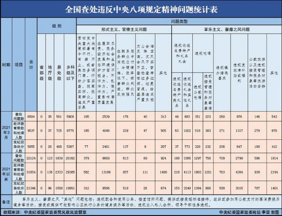 中新網4月25日電 據中央紀委國家監委網站消息,4月25日,中央紀委國家監委公布了2021年3月全國查處違反中央八項規定精神問題匯總情況。當月,全國各級紀檢監察機關共查處違反中央八項規定精神問題6504起,批評教育幫助和處理9537人,其中黨紀政務處分5855人。