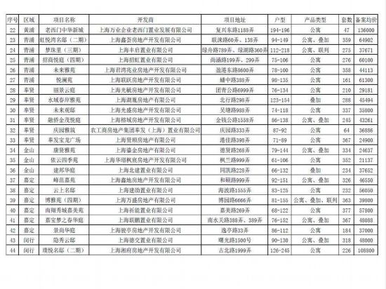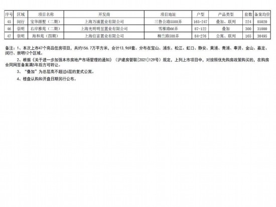 該批房源47個項目,總面積約156.7萬平方米,共計13,969套,分布在寶山、浦東、松江、虹口、靜安、黃浦、青浦、奉賢、金山、嘉定、閔行、崇明等12個區域。這批房源中大部分為剛需盤,單套面積100平方米以下的占比約三分之二,31個樓盤的備案均價為6萬以下。該批房源中,一年內續盤項目27個,同類型房屋備案均價均未上漲。