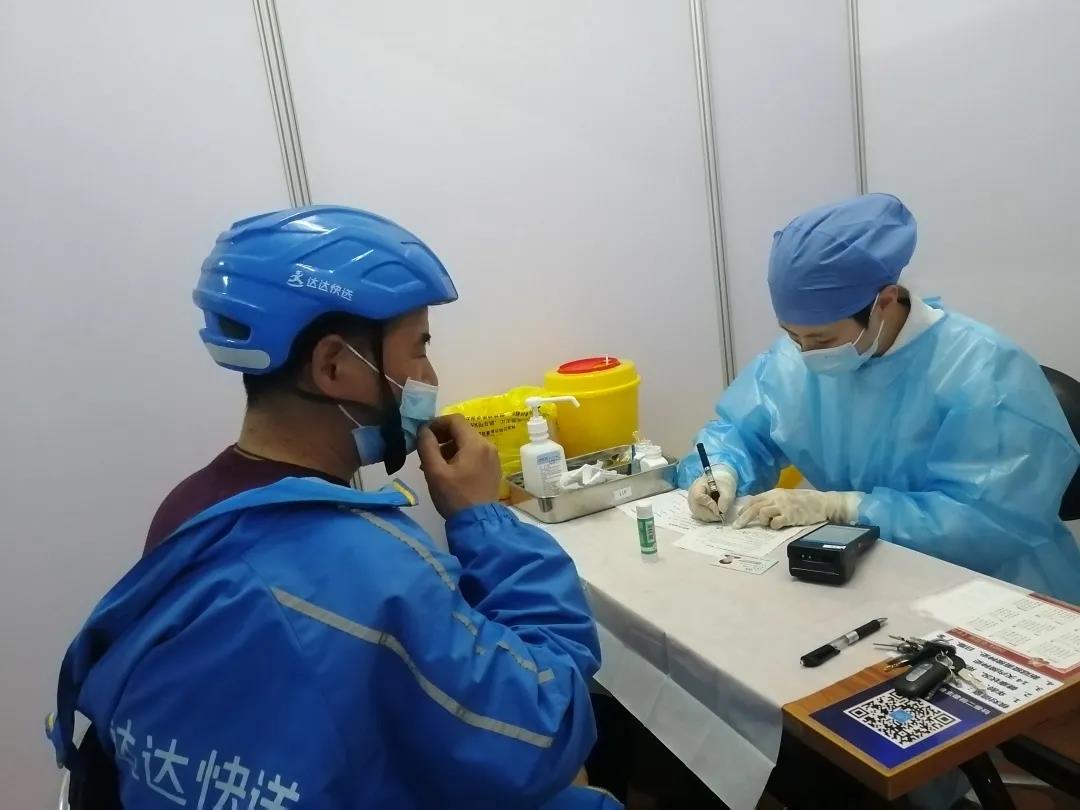 記者了解到,為方便配送員們接種疫苗,楊浦區衛健委、平涼路街道市場監管所和達達集團三方聯合,與接種點積極協調,開辟“即來即打”的疫苗接種綠色通道,并由街道市場監管所的工作人員接待引導。