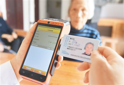 在廣西賀州市平桂區獅南村衛生室,醫生用“村醫通”系統刷病人身份證進行醫療費用結算。