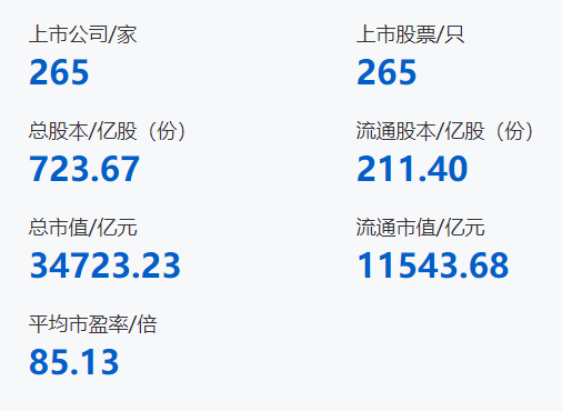 上交所數據顯示,截至2021年4月22日,科創板265家上市公司總市值達34723.23億元,流通市值11543.68億元,平均市盈率約85倍。