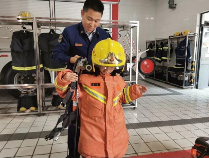 隨后,小宇開啟了換裝模式。在消防員的指導下,他穿上消防救援服、戴上大檐帽、背上空氣呼吸器,儼然化身成了一個小小消防員。