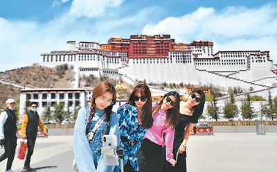 來自重慶的游客在西藏拉薩布達拉宮廣場留影。