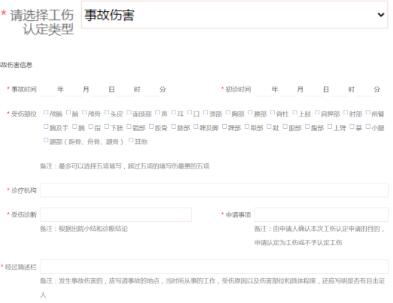 工傷認定類型選擇事故傷害,補充具體事故傷害信息。