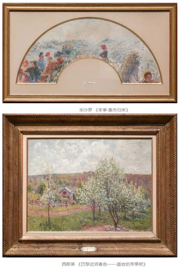 畢沙羅和西斯萊也是印象派中的重要代表畫家,他們以風景畫見長。展覽中畢沙羅的《冬季·集市歸來》這件作品獨特的扇形的處理方式影響了后印象派畫家高更,高更遂買下這件作品并于1879年在第四次印象派展覽中展出。西斯萊《巴黎近郊春色——盛放的蘋果樹》是瑪摩丹莫奈博物館收藏的奠基性印象派作品之一。