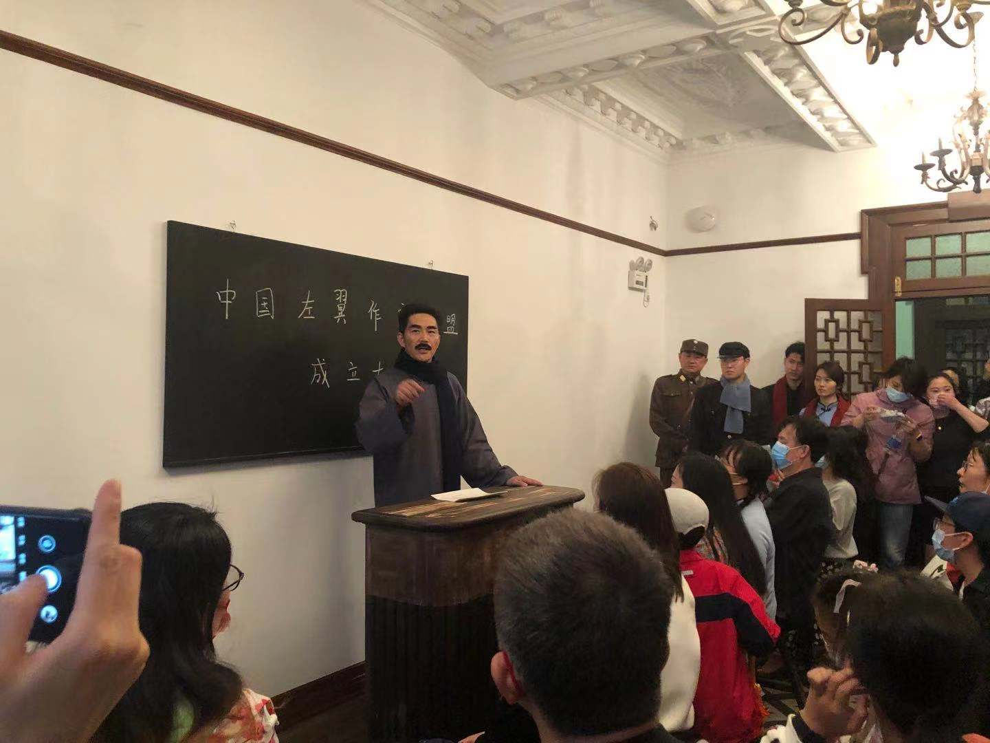 人民網上海5月4日電 (葛俊。┰凇爸袊笠碜骷衣撁顺闪⒋髸鄙像雎狋斞赶壬难葜v、在景云里游行示威隊伍里高聲吶喊、在左聯會址紀念館祭奠先烈……5月4日,上海首個沉浸互動式紅色文化情景劇《青春為祭》在多倫路首演。該劇以魯迅、丁玲、李偉森為主要人物,形成三條獨立路線,展示了左聯五烈士被捕犧牲前后的事件進程,再現了各位烈士及革命志士的心路歷程。